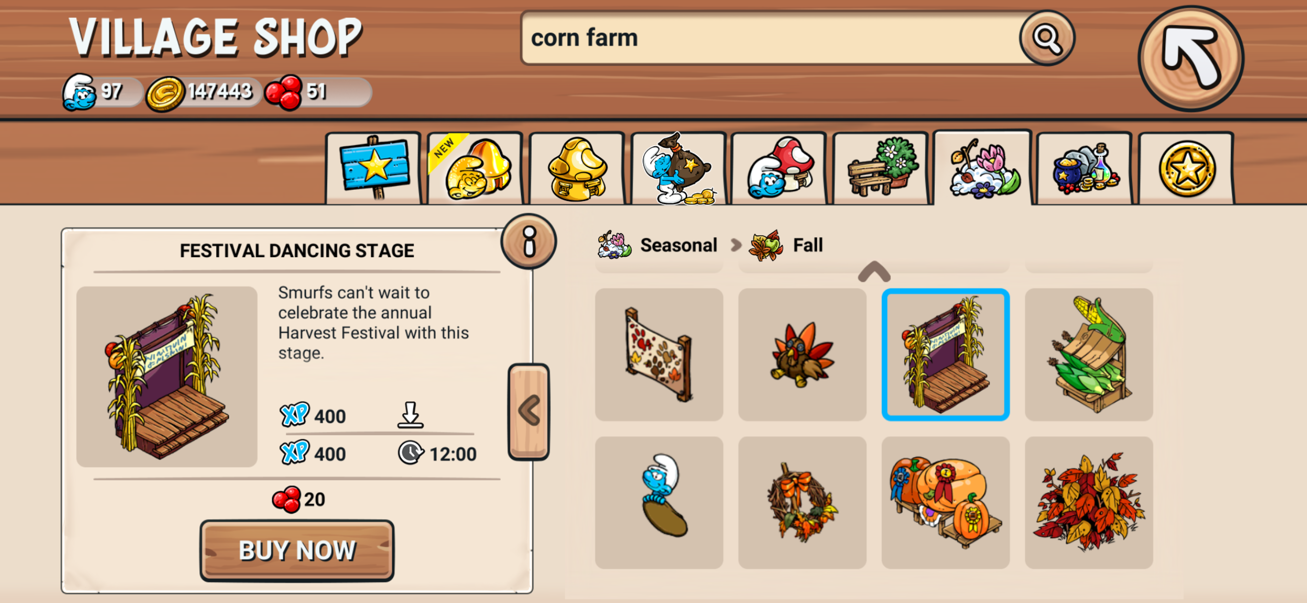 가장 인기 있는 아이템은 ‘황금 옥수수 조각상’, ‘호박 조명길’, 그리고 신규 스머프인 ‘축제 요리사 스머프’입니다. 요리사 스머프는 음식 제작 속도를 2배 높여주는 패시브 스킬을 보유하고 있어 자원 회전에 큰 도움이 됩니다.